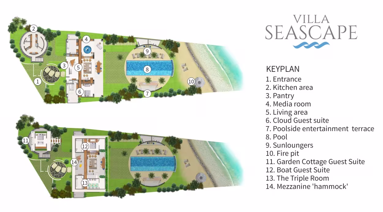 Das doppelstöckige Wohnzimmer, das Medienzimmer und die drei Gästezimmer der Villa Seascape befinden sich in einem modernen, zweistöckigen Gebäude mit Meerblick. Das vierte Gästezimmer befindet sich im oberen Stockwerk des Garden Cottage, einem separaten Gebäude hinter dem Haupthaus. Die Serviceküche befindet sich im Erdgeschoss des Garden Cottage. Vom Eingang aus führen Stufen über einen Teich im Innenhof direkt in den Wohnbereich mit einer offenen Gästeküche auf der linken Seite, einer Schlafzimmersuite im Erdgeschoss und einer Gästetoilette auf der rechten Seite und ein paar Stufen hinunter zum Hauptwohnzimmer. Dieses öffnet sich zu einer Essterrasse, hinter der sich der Swimmingpool, die Sonnenterrasse, die Poolbar und Sitzgelegenheiten am Strandrand um eine Feuerstelle befinden. Neben dem Wohnbereich befindet sich das Medienzimmer, das als fünftes Schlafzimmer mit angeschlossenem Badezimmer eingerichtet werden kann. Zwei weitere Gästezimmer flankieren die obere Ebene und sind durch eine Hängebrücke verbunden, die auch Zugang zum Zwischengeschoss mit Netzboden über dem Eingangs- und Küchenbereich bietet.