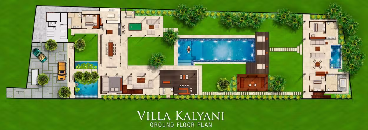 Además de estar a un paseo razonable de la playa, las comodidades de Kalyani, como una sala de televisión privada con pantalla de proyección, sistemas de sonido interiores y exteriores, una cabina de DJ privada y varias bases para iPod, hacen que las horas de luz solar sean inolvidables y estén llenas de música. La piscina de 22 x 5,5 metros y la piscina de inmersión de 7 x 3 metros junto al hermoso jardín de la villa permiten darse un refrescante chapuzón privado a medianoche.