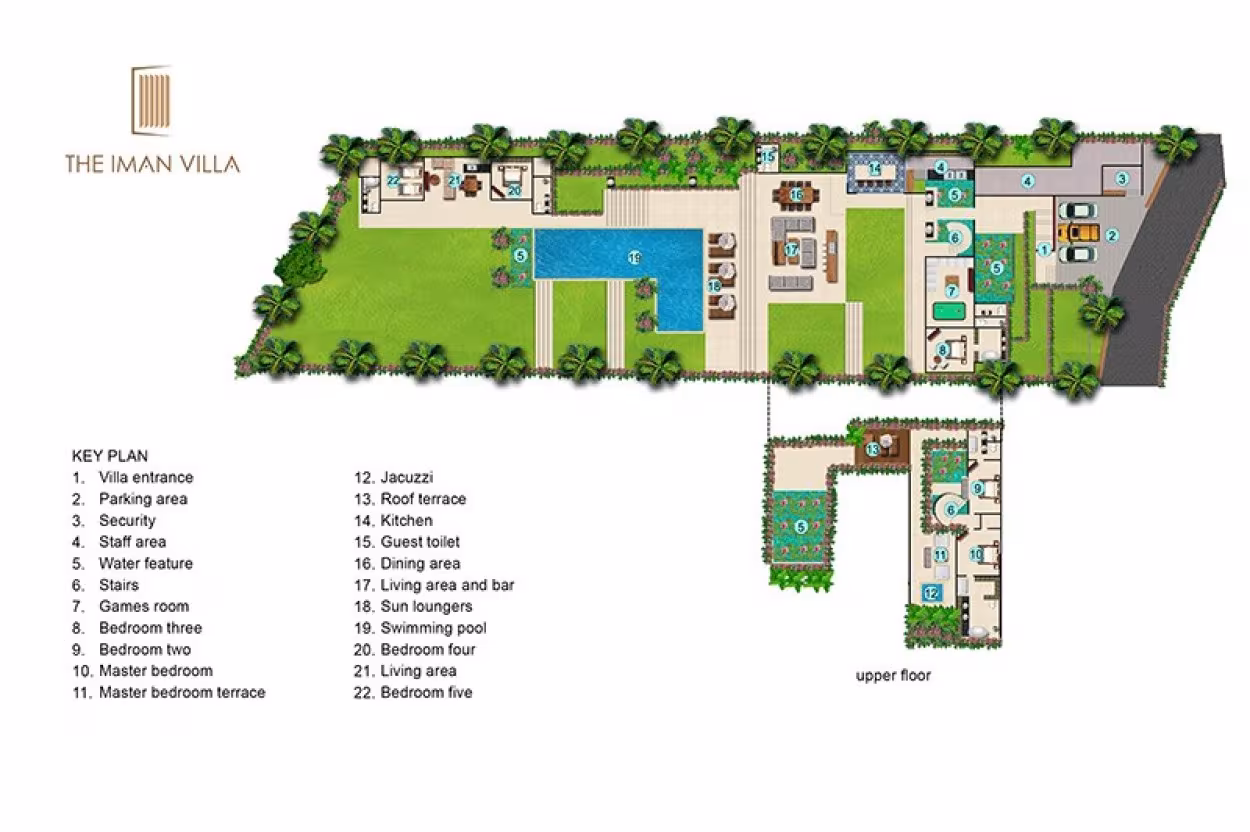 Además de ser una villa de diseño excepcional, Villa The Iman es muy popular entre las familias. A los niños les encantará la piscina infantil, la variedad de juguetes inflables, el jacuzzi en la azotea, la mesa de billar y las amplias zonas de césped en terrazas. El horno de pizza también será un éxito seguro entre ellos. Para los grupos más grandes, la piscina infinita y la sala de estar abierta con su elegante zona de estar hundida crean el centro social perfecto. Además, hay un espacio más pequeño con salón, comedor y cocina en la casa de huéspedes con dos habitaciones, ofreciendo amplias opciones de privacidad.