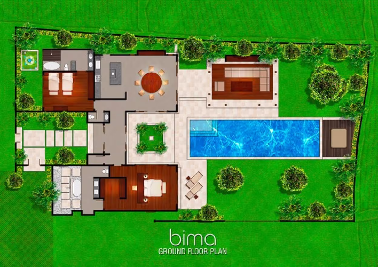В этот современный комплекс входит 5 вилл с просторными спальнями, ванными на открытом воздухе, открытыми жилыми и обеденными павильонами с оборудованными кухнями, плавательными бассейнами, шикарными тропическими садами, коллекциями искусства, прудами и фонтанами, кабельным ТВ и DVD комнатами, а также WiFi по всей территории комплекса.